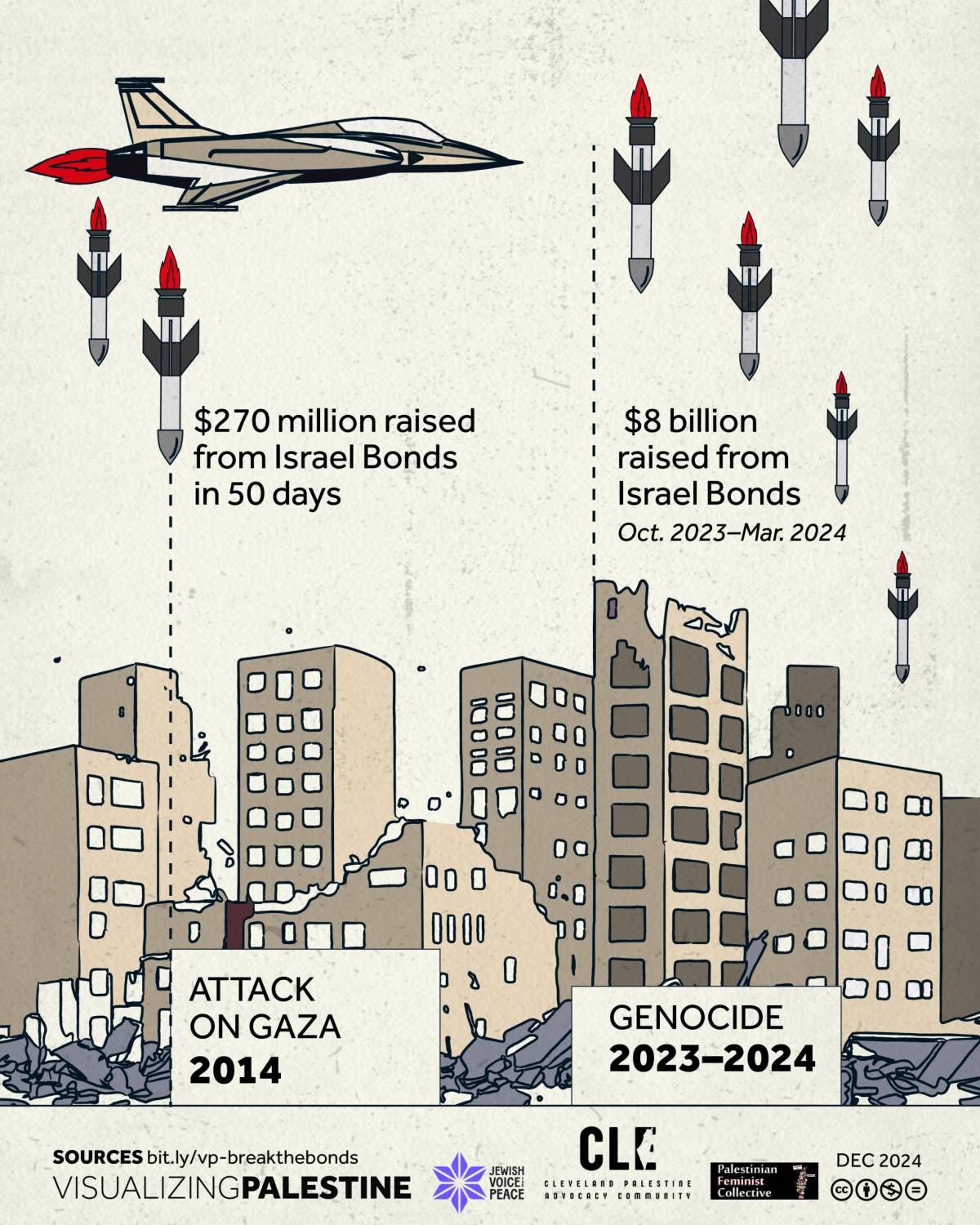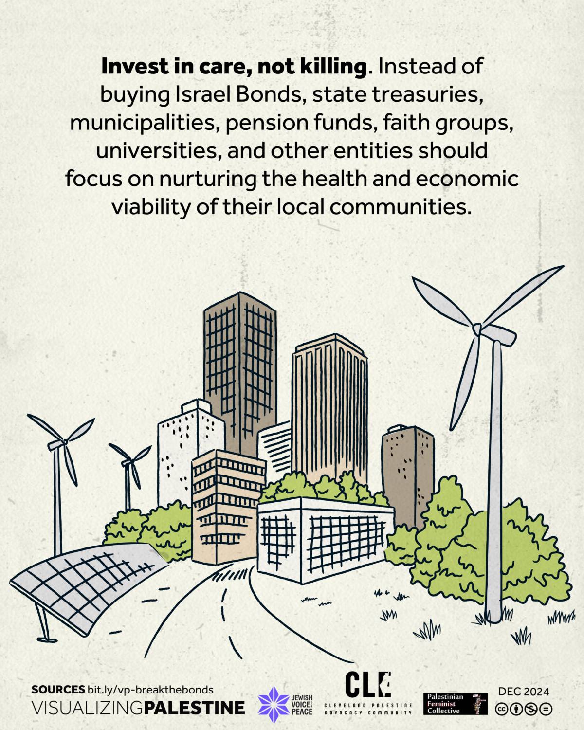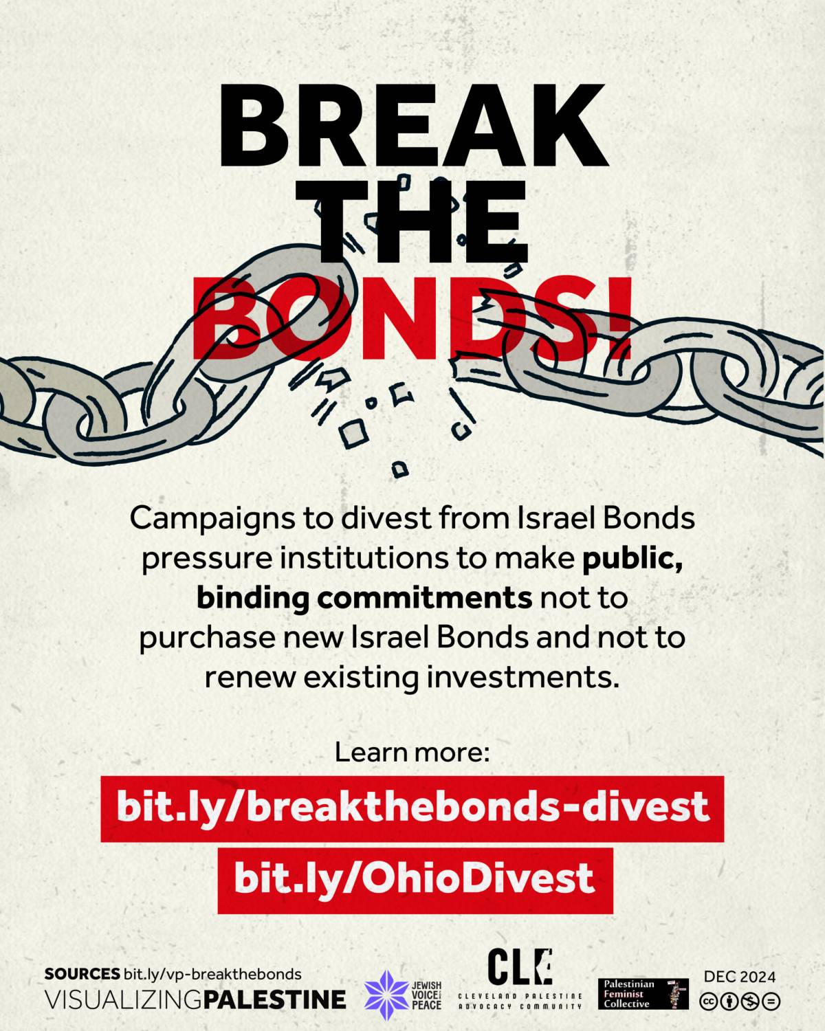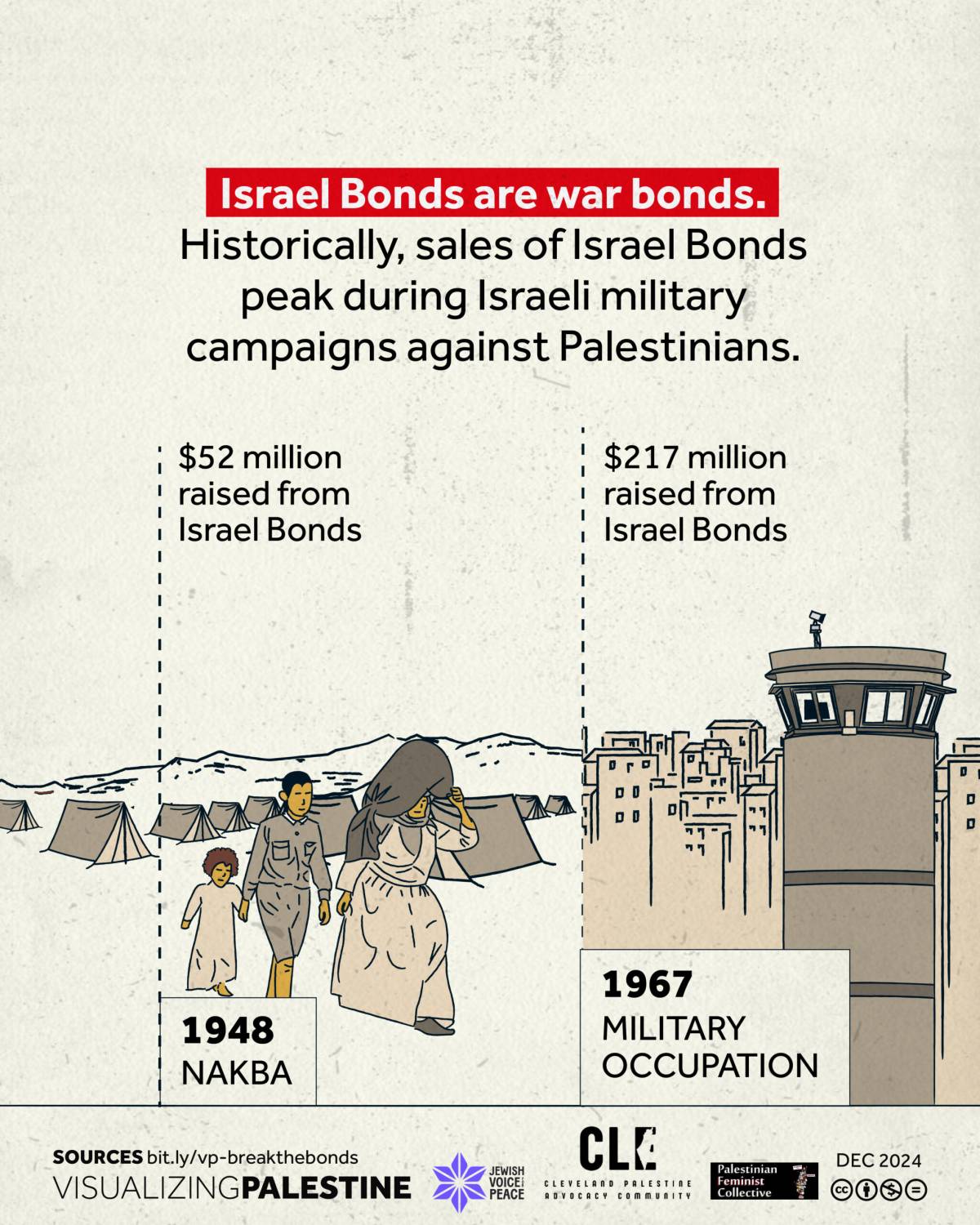 [December 2024]. Cuyahoga County, Ohio organizers are pressuring their municipality to stop using millions in public funds to buy Israel Bonds. To support their vital efforts and the broader Break the Bonds campaign, we partnered with the Cleveland Palestine Advocacy Community, Jewish Voice for Peace, and the Palestinian Feminist Collective on this visual explainer of Israel Bonds, their role in sustaining colonialism and genocide, and what we can do about it.