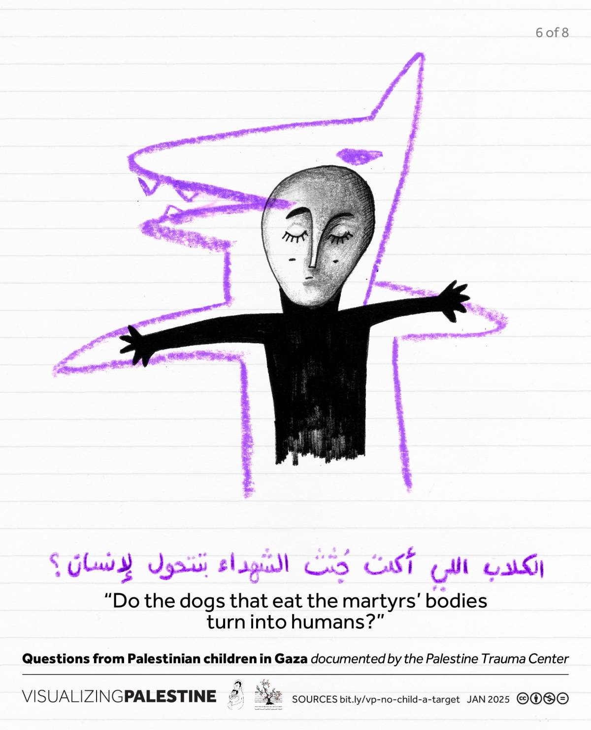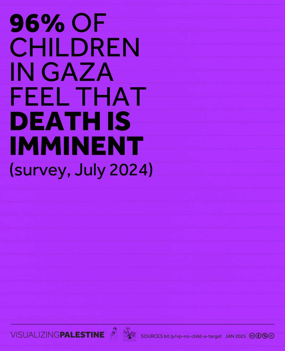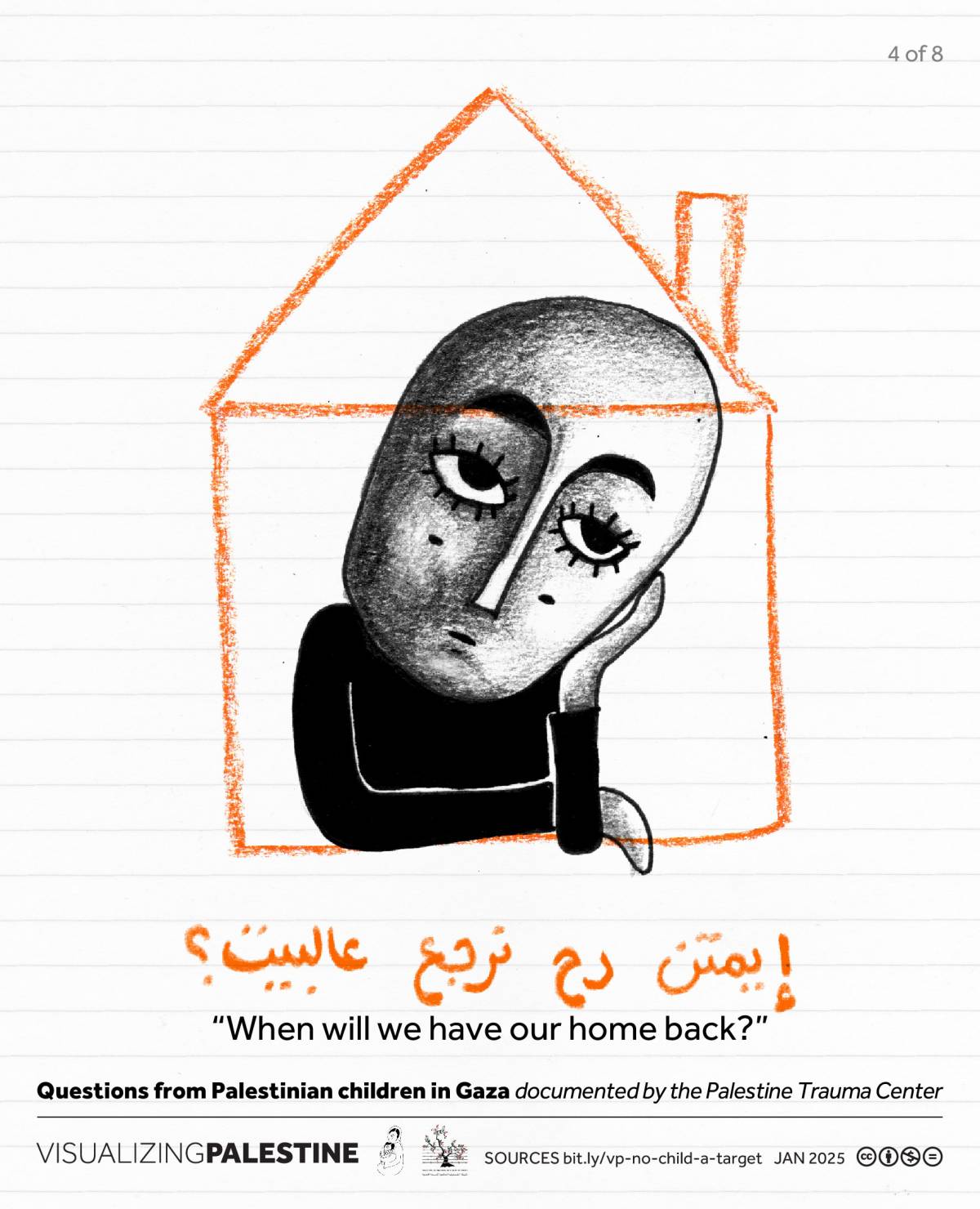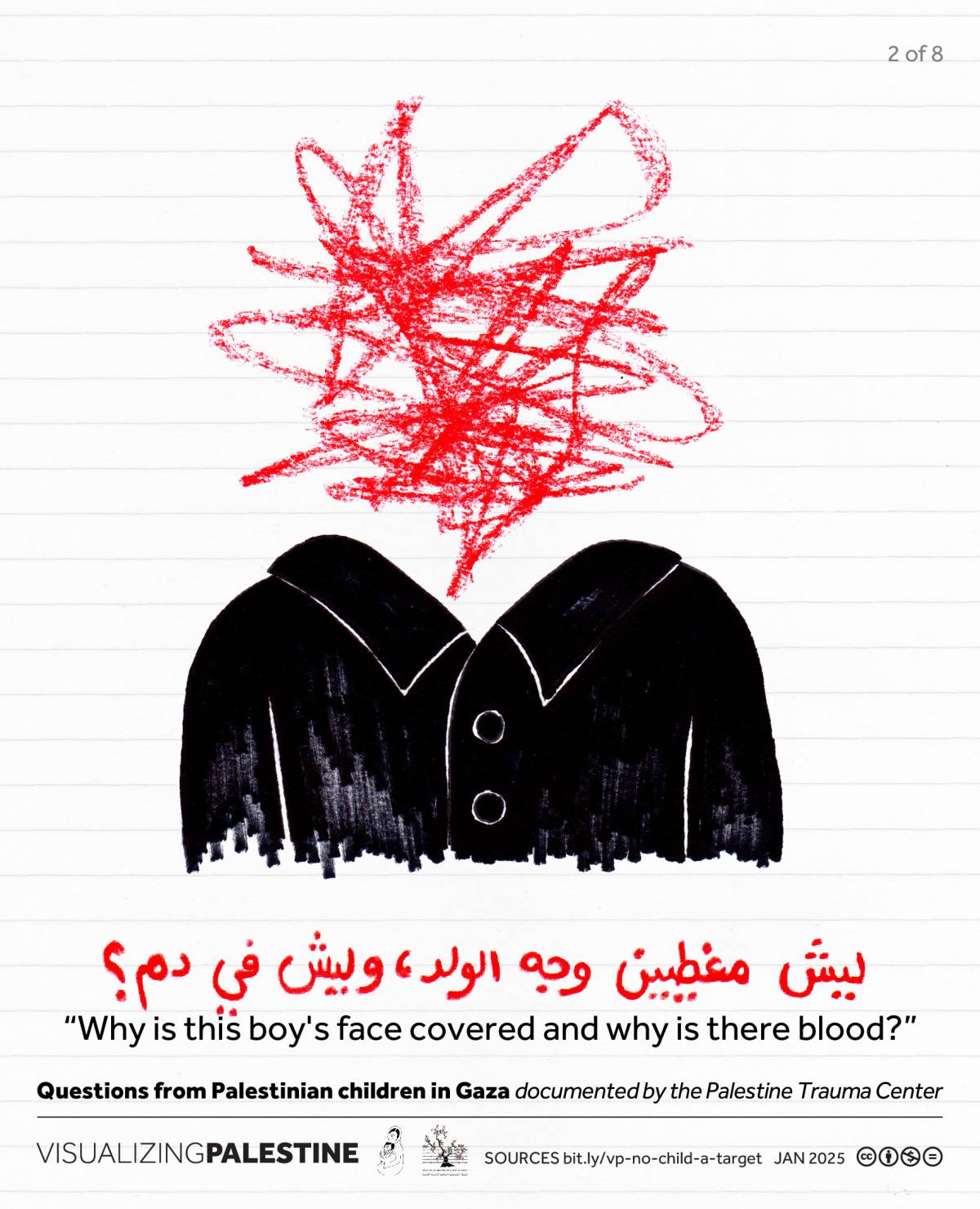 Our latest series, created in collaboration with the #NoChildATarget campaign, features Palestinian children’s questions documented by staff at the Palestine Trauma Center-UK’s clinic in Gaza. The campaign, spearheaded by the Palestine-Global Mental Health Network in collaboration with international counterparts, also calls on governments to stop supplying Israel with weapons and advocates for immediate protection, humanitarian aid, and trauma-informed care for Palestinian children.