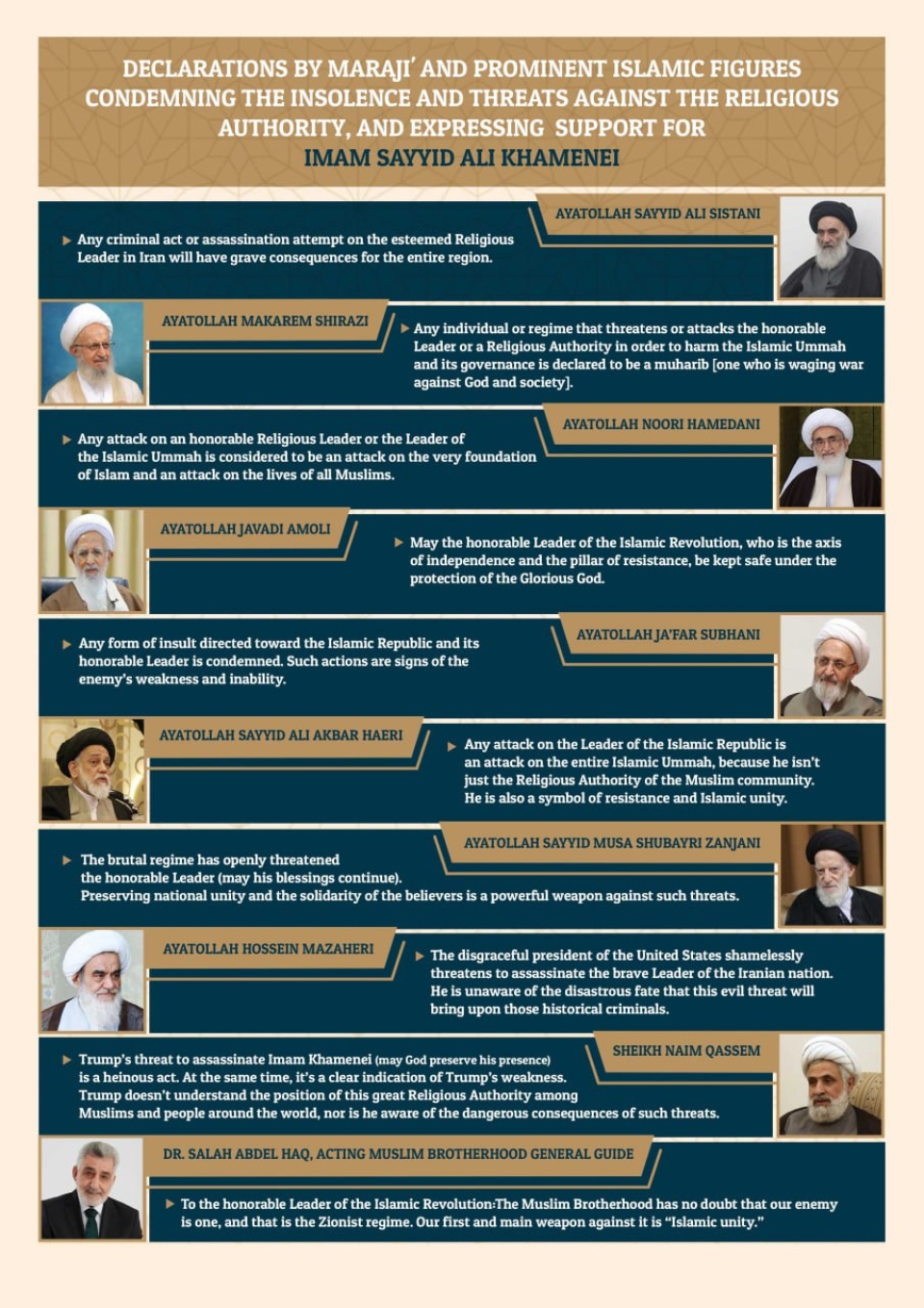 Friday, July 4, 2025Declarations by Maraji' and prominent Islamic figures condemning the insolence and threats against the Religious Authority, and expressing support for...