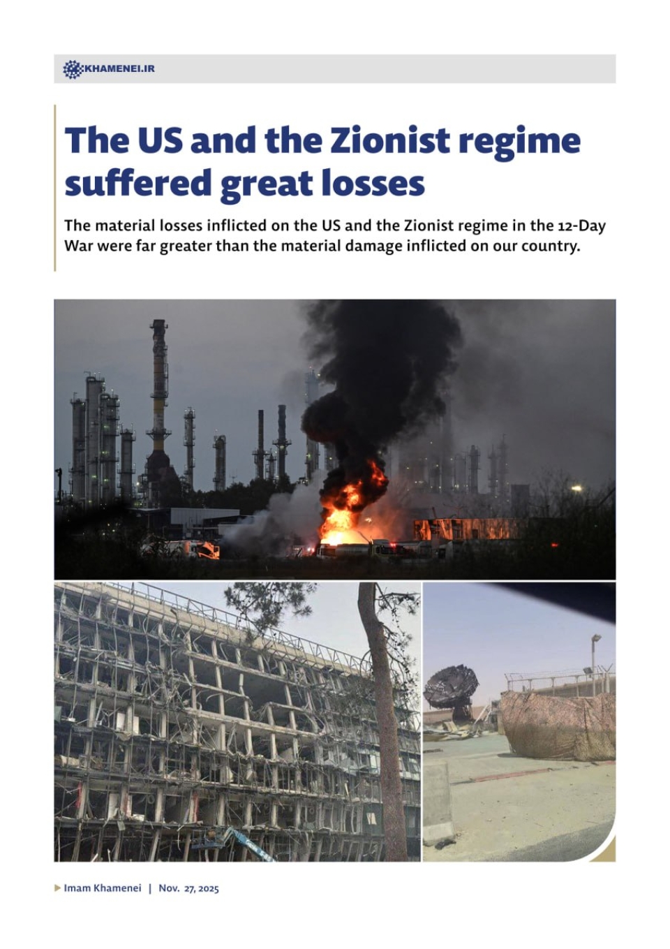 Sunday, November 30, 2025The US and the Zionist regime suffered great losses The material losses inflicted on the US and the Zionist regime in the 12-Day War were far great...