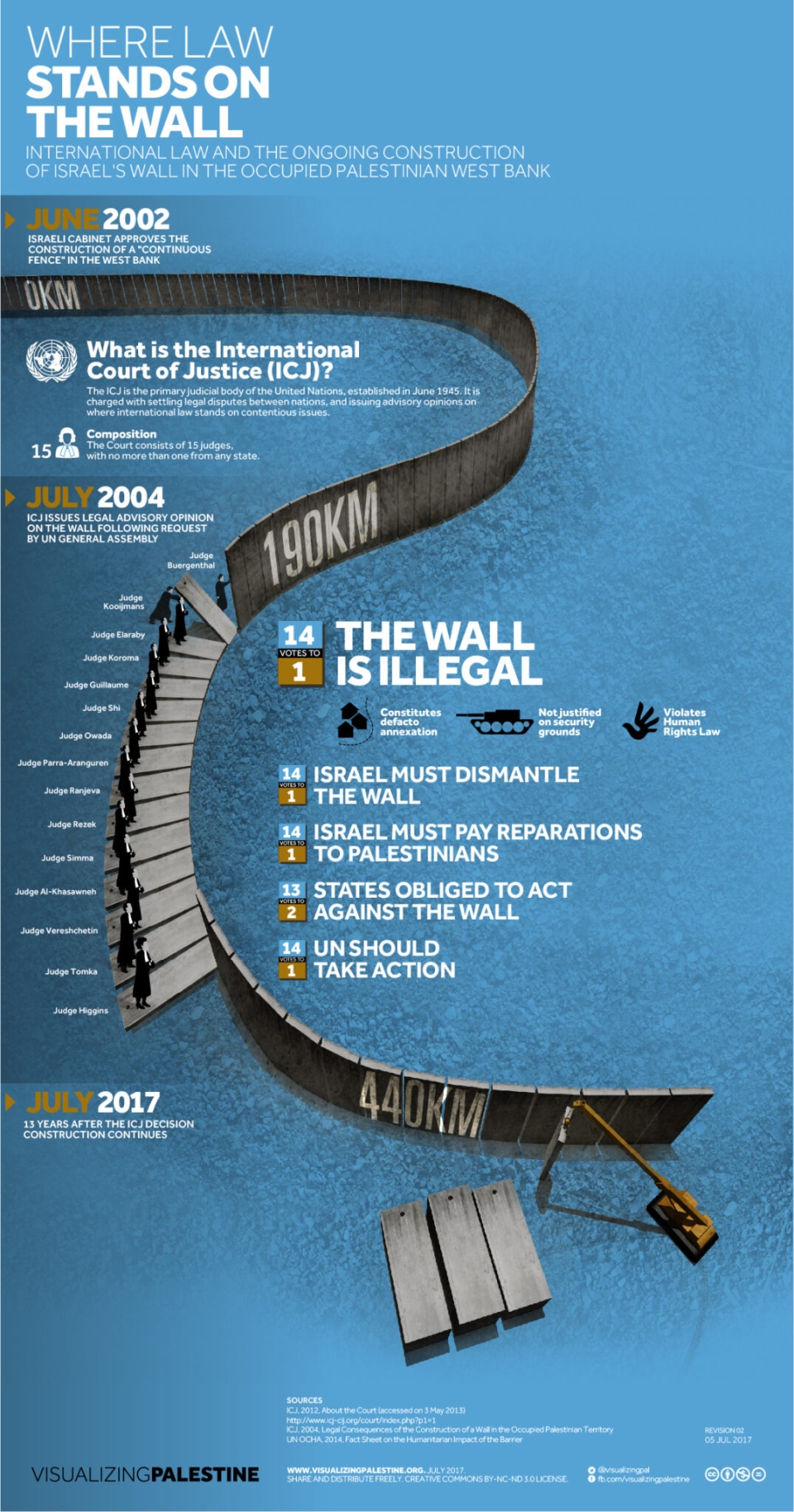 [Updated July 2017] In June 2002, the Israeli cabinet approved the construction of a "continuous fence" in the West Bank. In July 2004, the International Court of Justice (ICJ) declared this barrier illegal, choosing to refer to it as a "wall". The infographic ‘Where Law Stands on the Wall’ describes the detail of ICJ's decision. Today, 13 years on, and despite wide condemnation, little has been done by the international community to hold the Israeli government accountable for its ongoing disregard of international law.